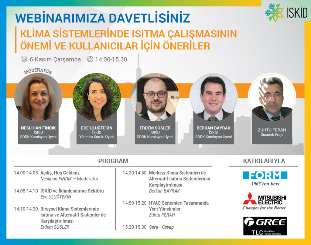 İSKİD, klimaların verimli şekilde ısıtma amaçlı kullanılabilirliğinin vurgulanması amacıyla, 6 Kasım Çarşamba günü saat 14:00'te "KLİMA SİSTEMLERİNDE ISITMA ÇALIŞMASININ ÖNEMİ VE KULLANICILAR İÇİN ÖNERİLER" konulu bir webinar organize etti.