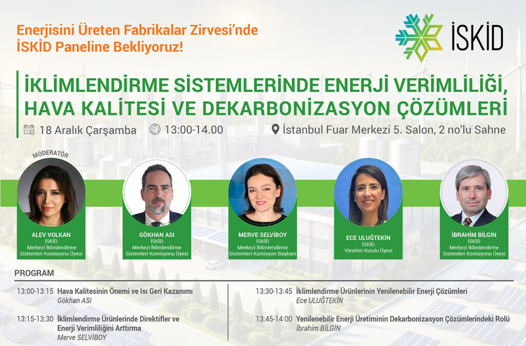 18 Aralık Çarşamba günü saat 13:00'te İstanbul Fuar Merkezi, Salon 5 - 2 No'lu Sahnede Enerjisini Üreten Fabrikalar Zirvesi kapsamında "İklimlendirme Sistemlerinde Enerji Verimliliği, Hava Kalitesi ve Dekarbonizasyon Çözümleri" konulu bir panel organize etti.